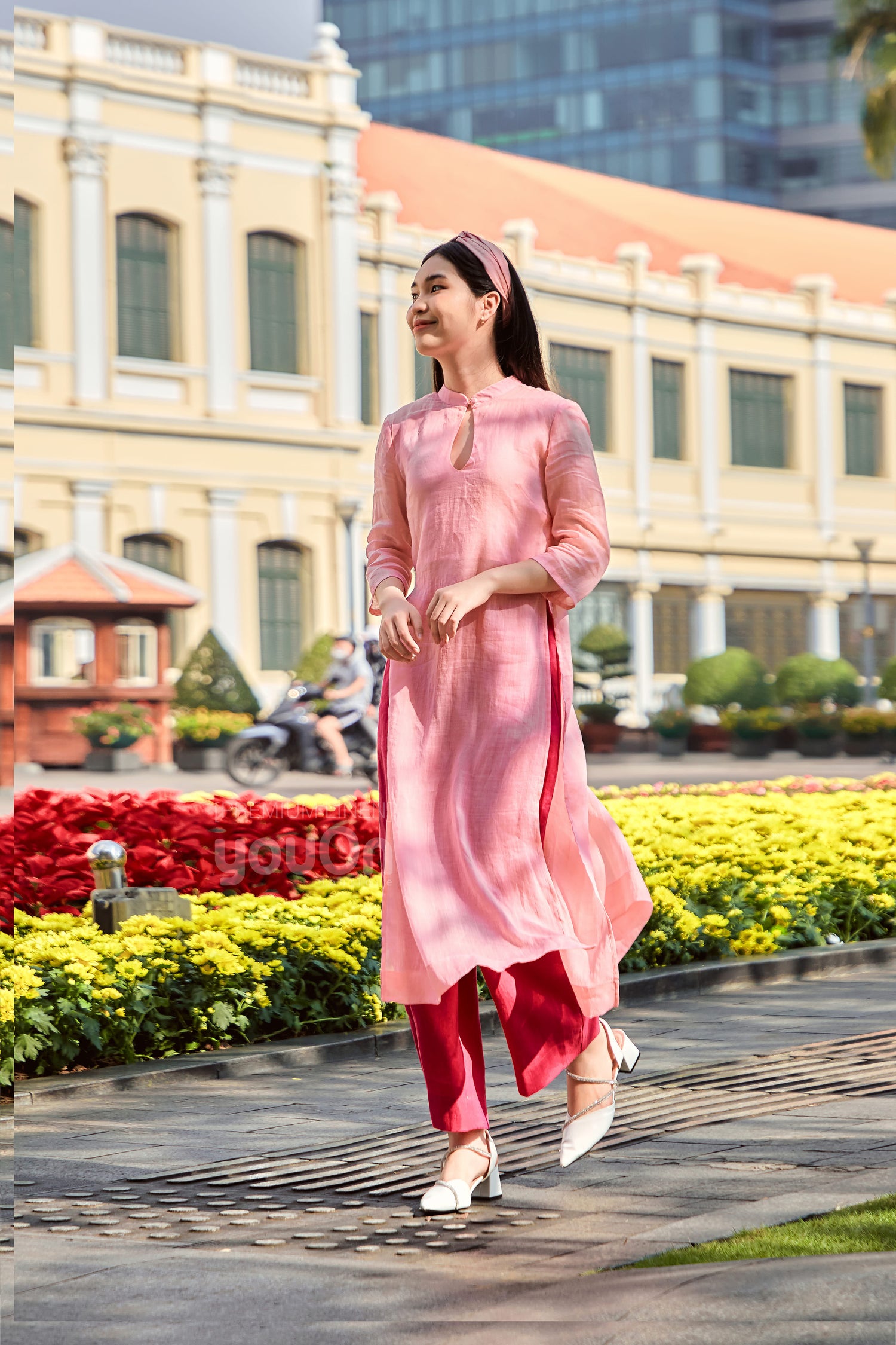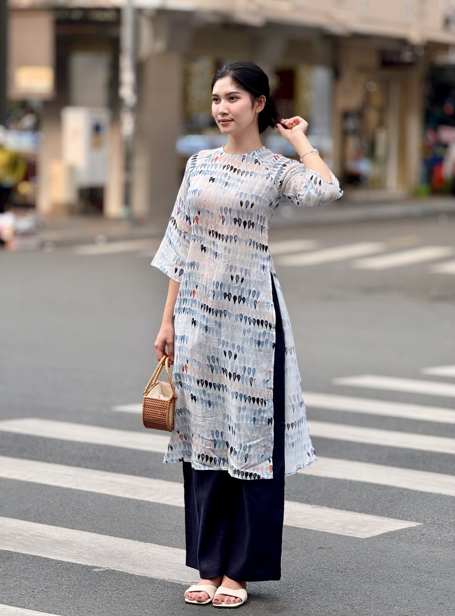 The women's linen ao dai combines Vietnam's classic charm with the relaxed luxury of linen fabric. Its graceful lines and breathable feel make it perfect for any occasion, blending tradition with modern comfort effortlessly.