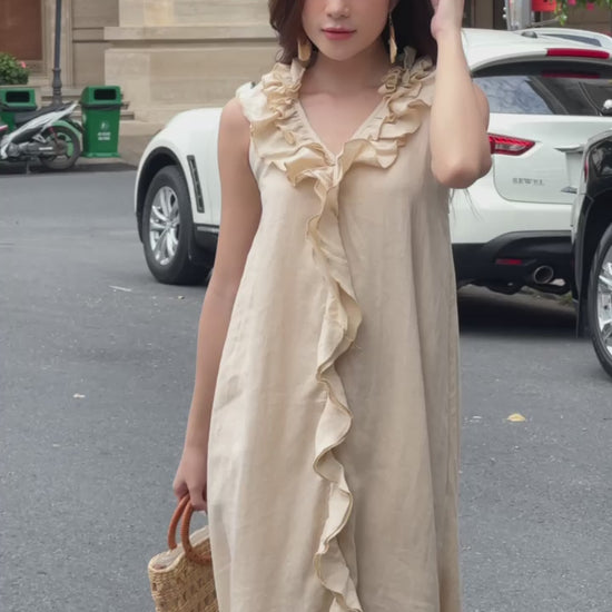 Đầm sát nách, với phần bèo được thiết kế từ cổ áo kéo dài xuống chân đầm tạo ra vẻ đẹp nữ tính, dịu dàng và quyến rũ, sang trọng.