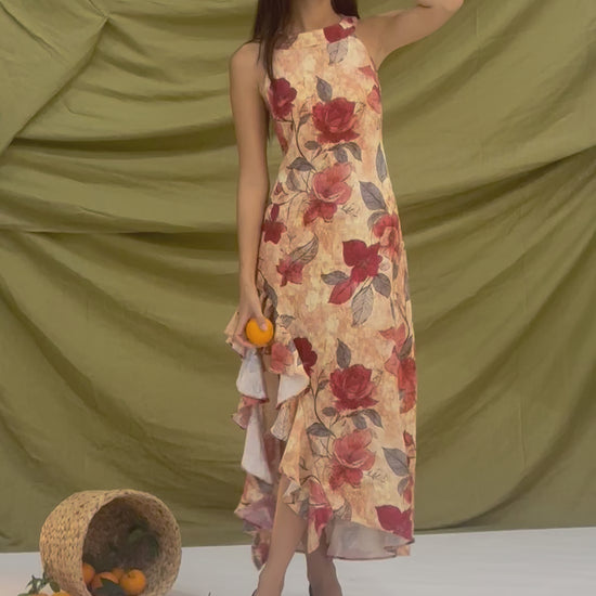 Sleeveless dress with a slightly hugging shape. Asymmetrical design with high slit and ruffled hem.