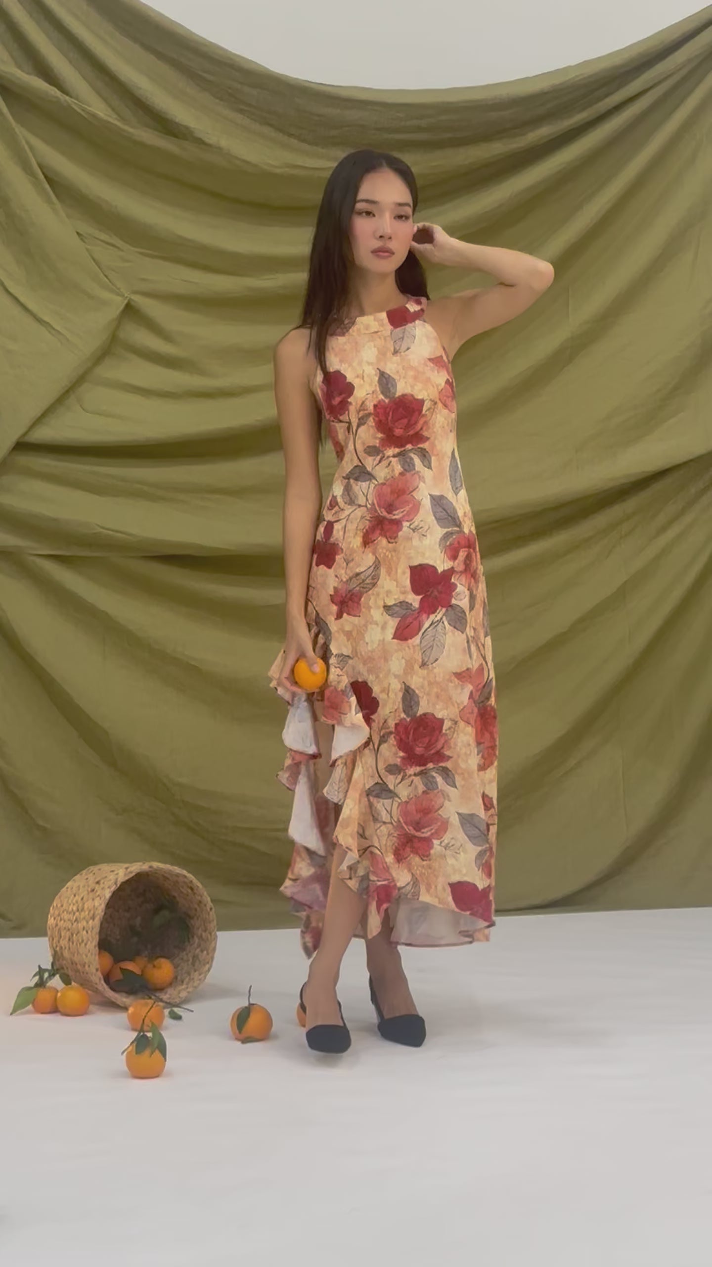 Đầm khoét nách có phom dáng ôm nhẹ. Thiết kế bất đối xứng với đường xẻ cao viền bèo