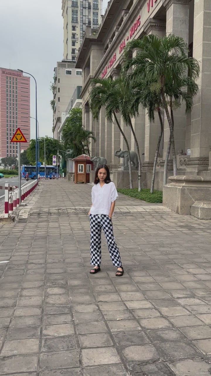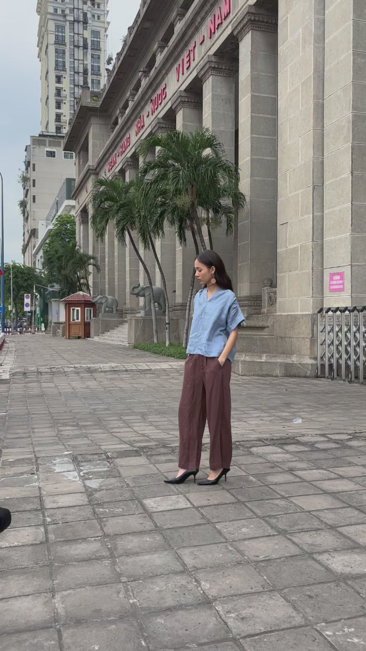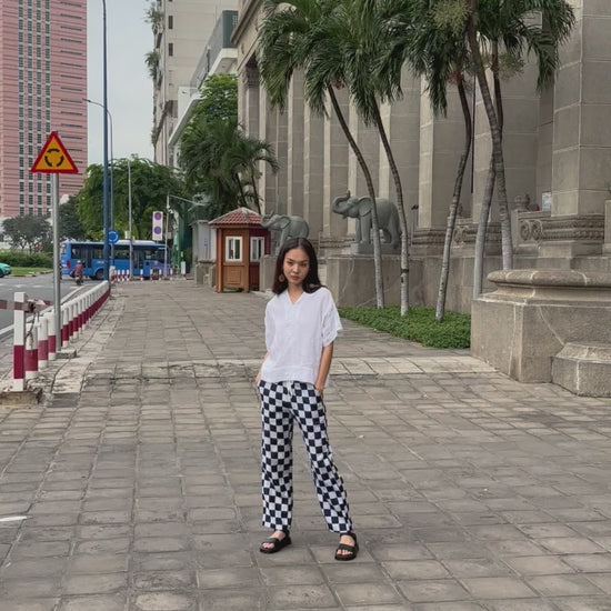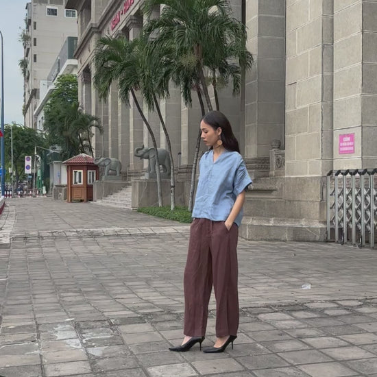 Áo dáng rộng, cổ V, tay ngắn, chiều dài vạt trước ngắn hơn vạt sau, tay áo nhún nhẹ
