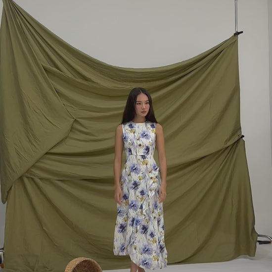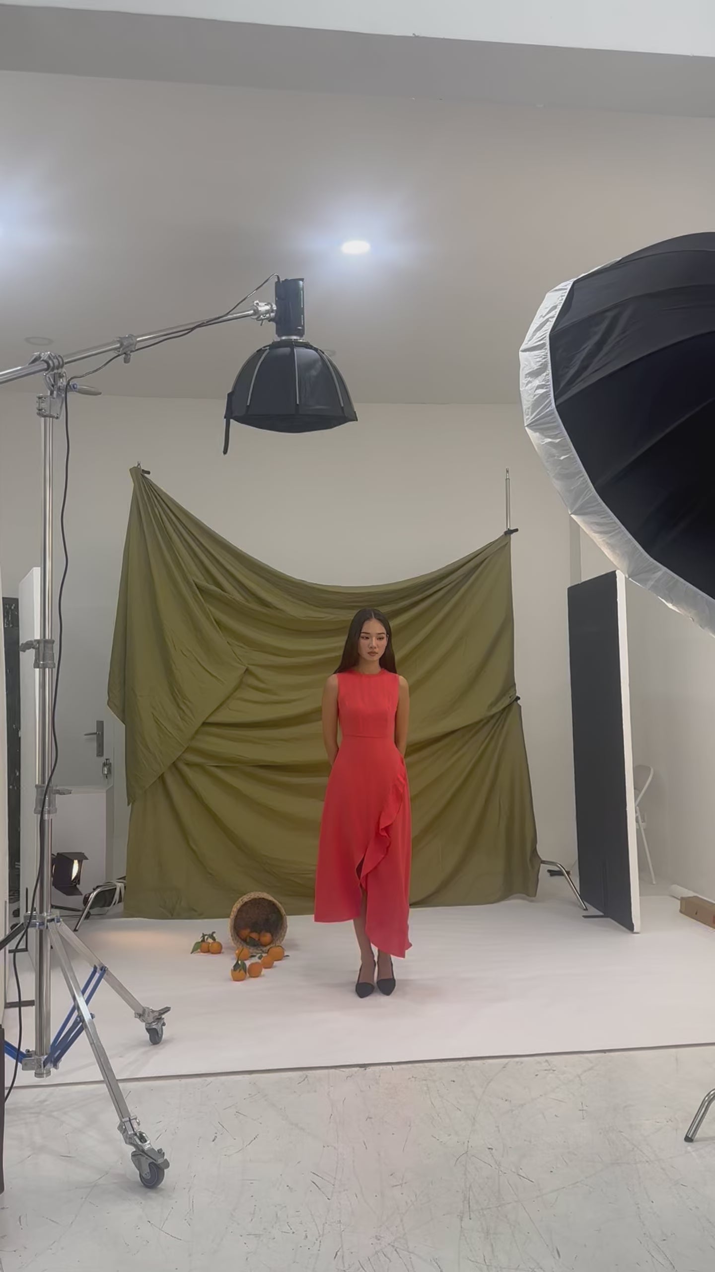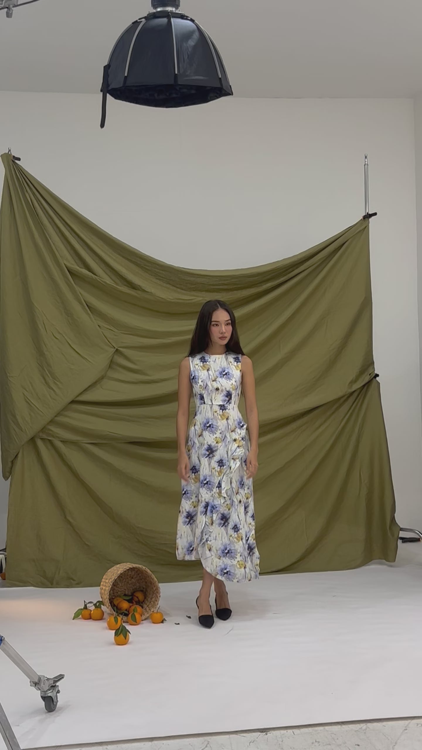Đầm sát nách có phom dáng ôm nhẹ. Thiết kế bất đối xứng với đường xẻ cao viền bèo