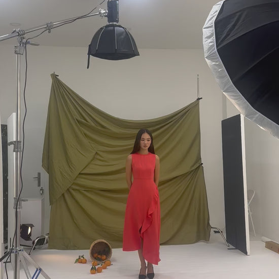 Sleeveless dress with a slightly hugging shape. Asymmetrical design with high slit and ruffled hem