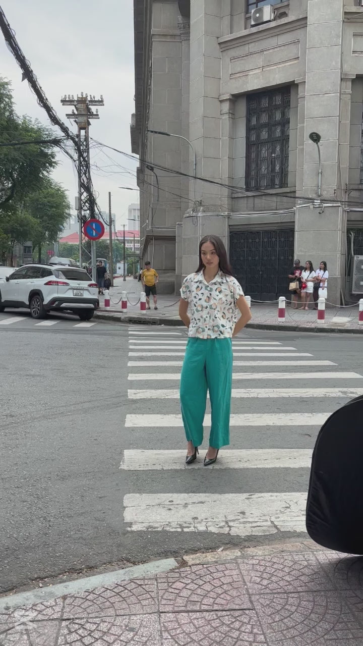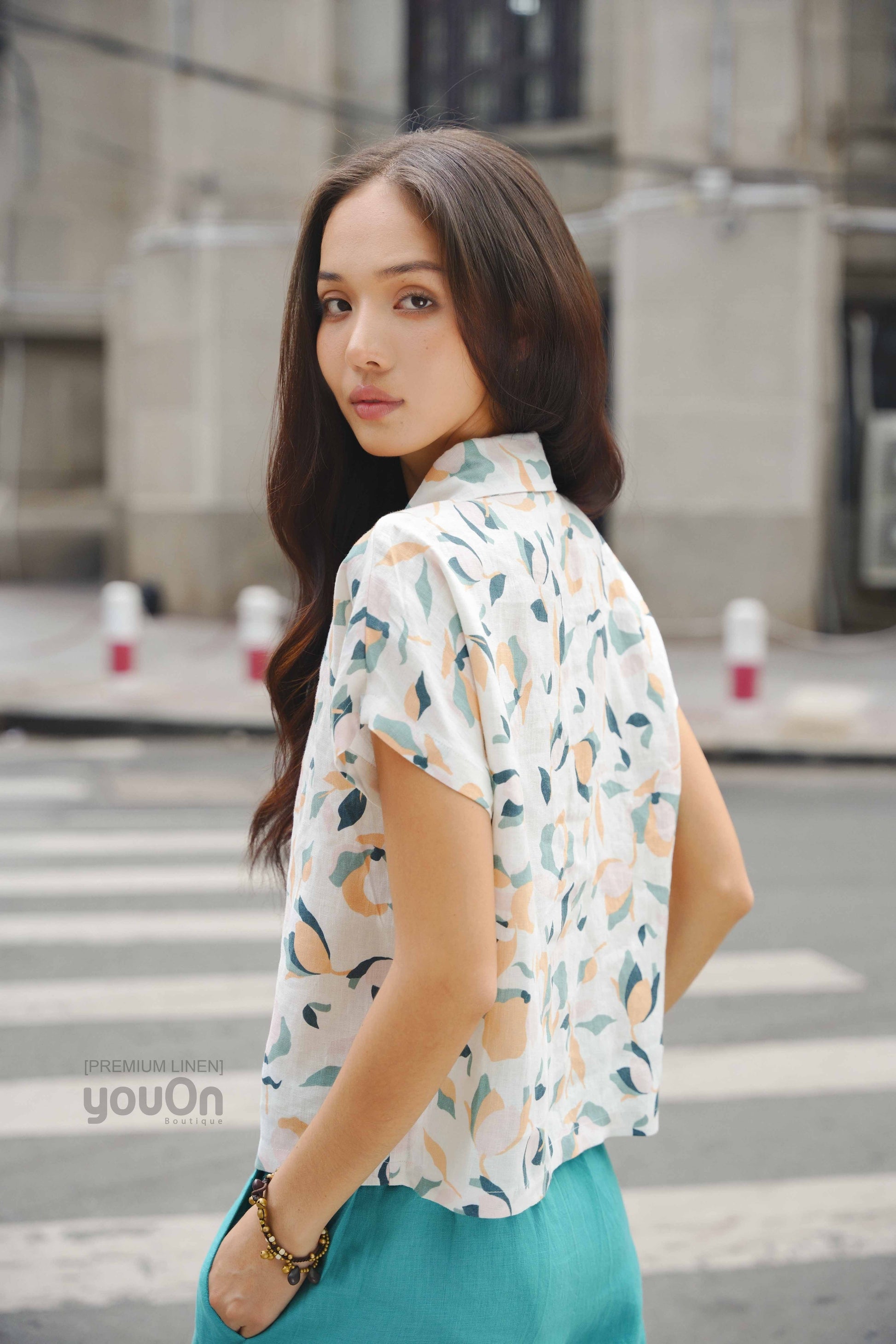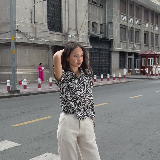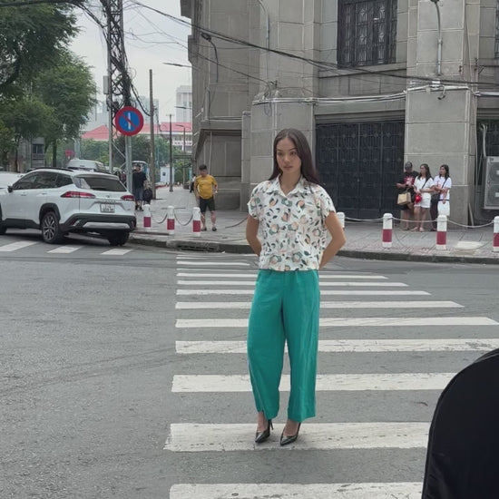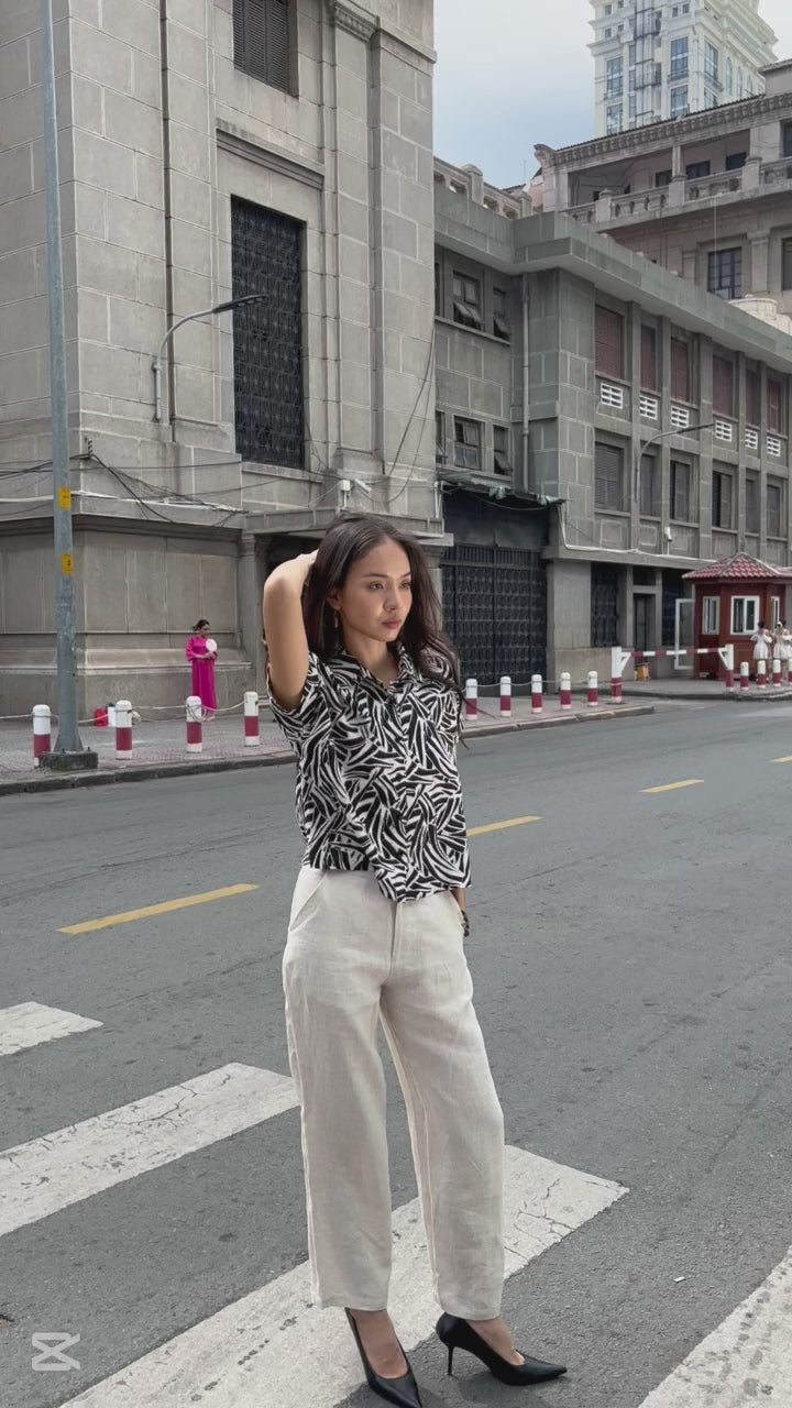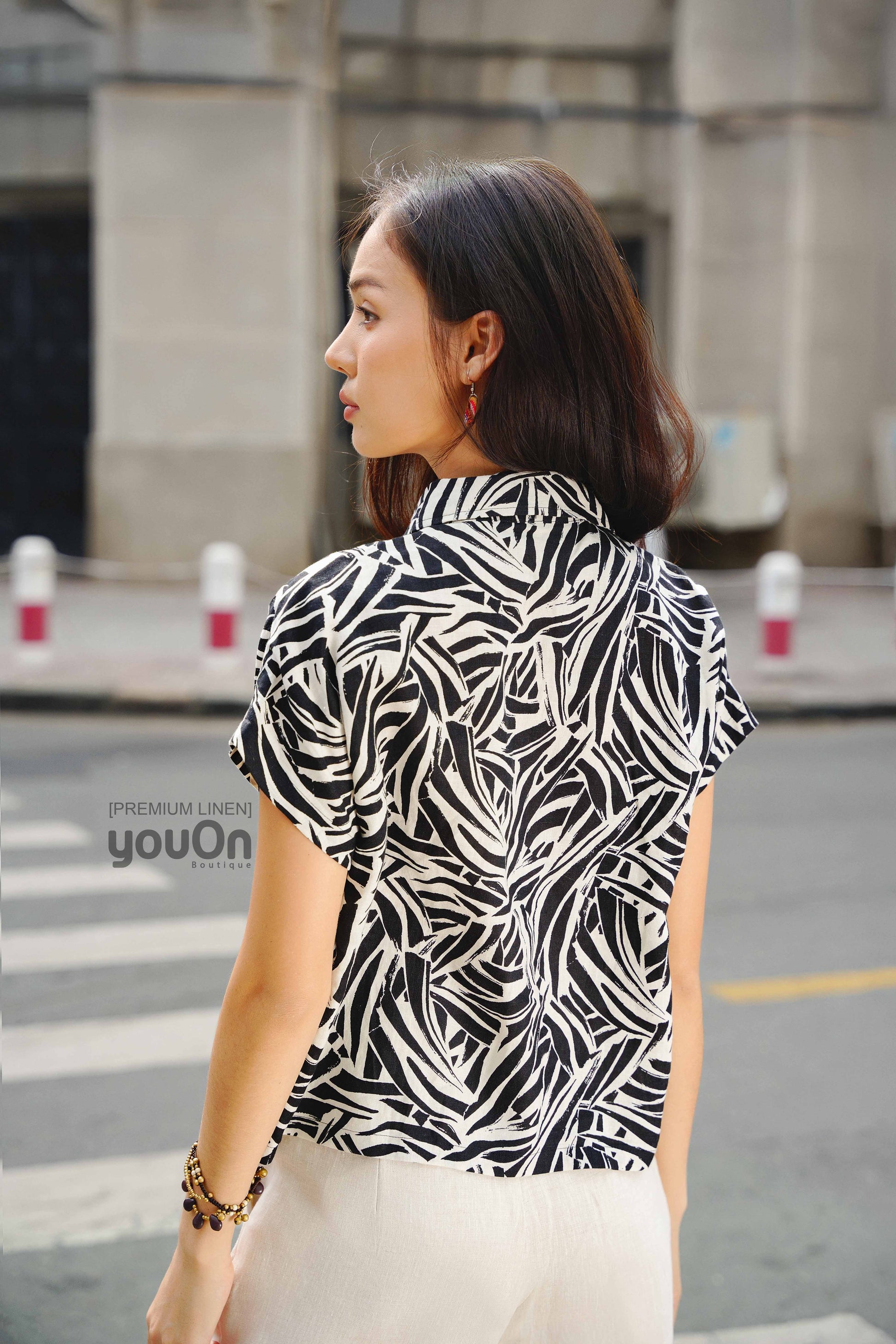 Chiếc áo sơ mi với cúc dọc, tay ngắn, cổ bẻ.
